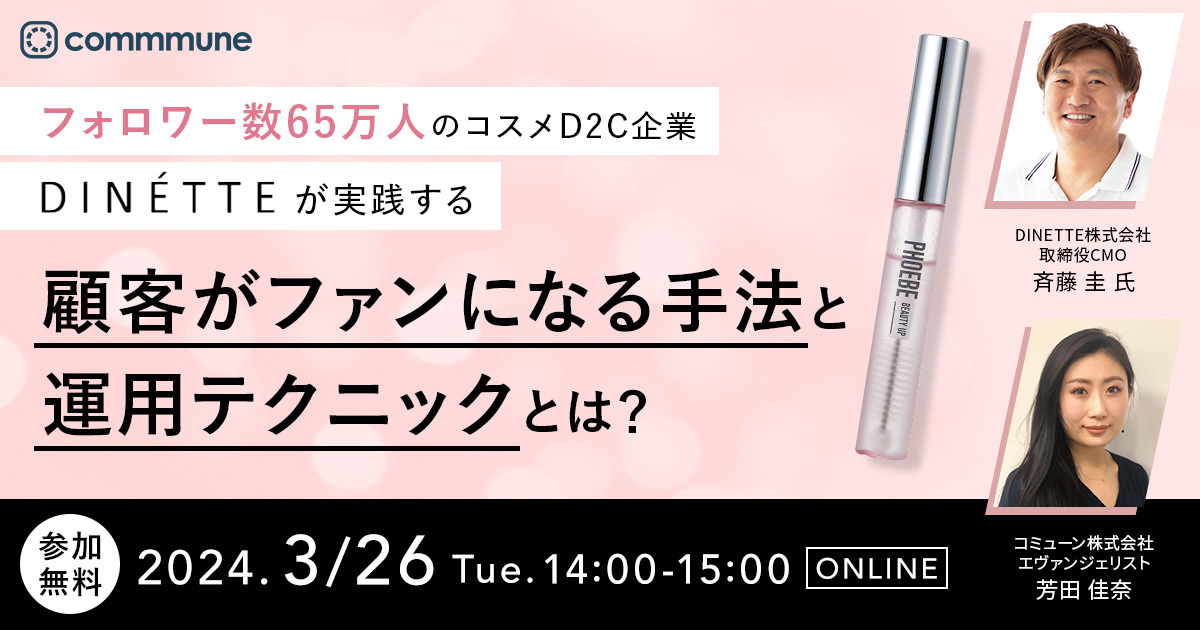 本セミナーでは、フォロワー総数65万人超のコスメD2C企業であるDINETTE株式会社より取締役CMO斉藤圭氏をお招きし、「顧客起点」で考える重要性からレッドオーシャンである美容市場においてファンを育成するために必要なコミュニケーション手法について余すことなく語っていただきます。セミナーの最後には質疑応答の時間を設けていますので、ファンマーケティングだけでなく、ブランディング・OMO施策等幅広い知見をもつ斉藤氏にお悩みを相談していただくことも可能です。